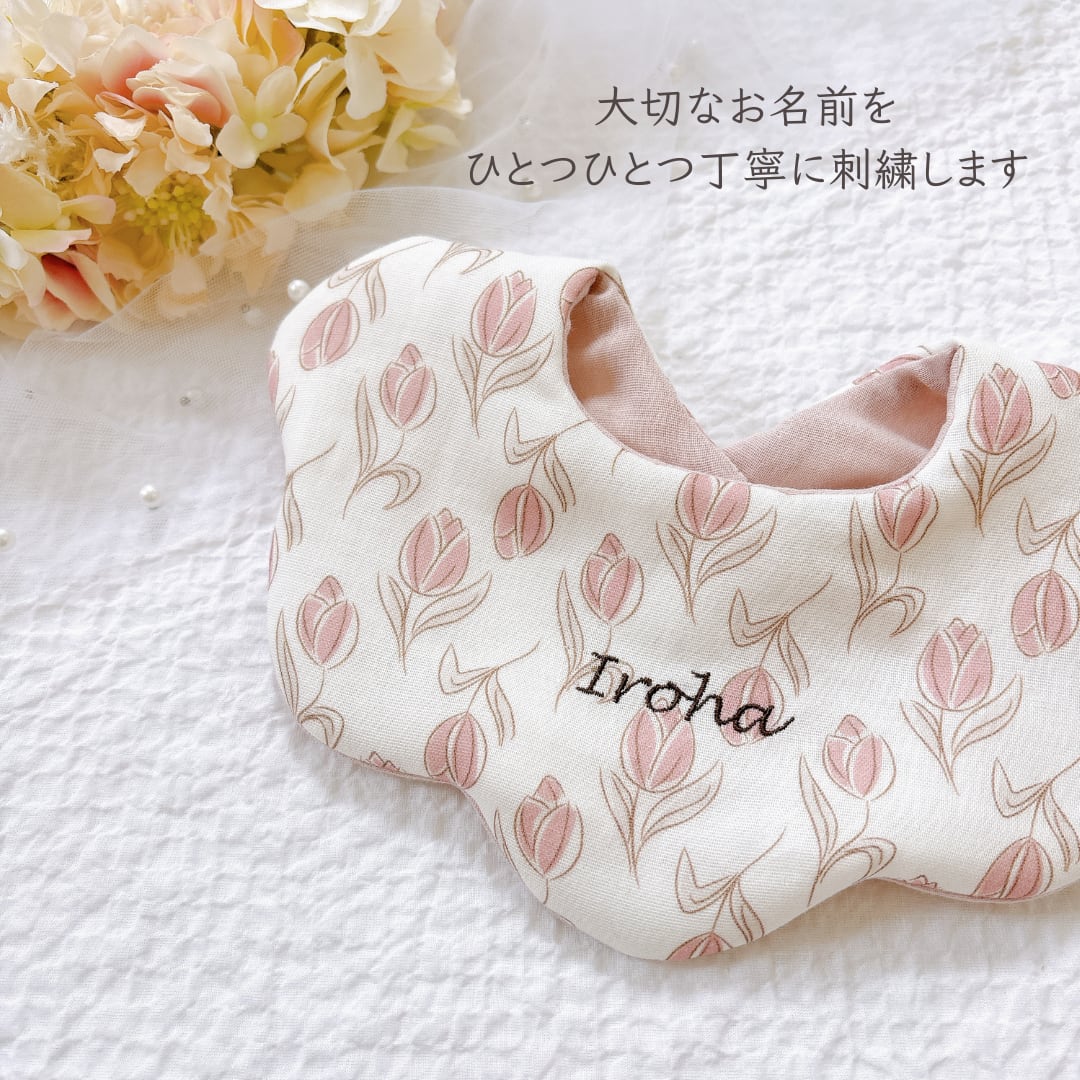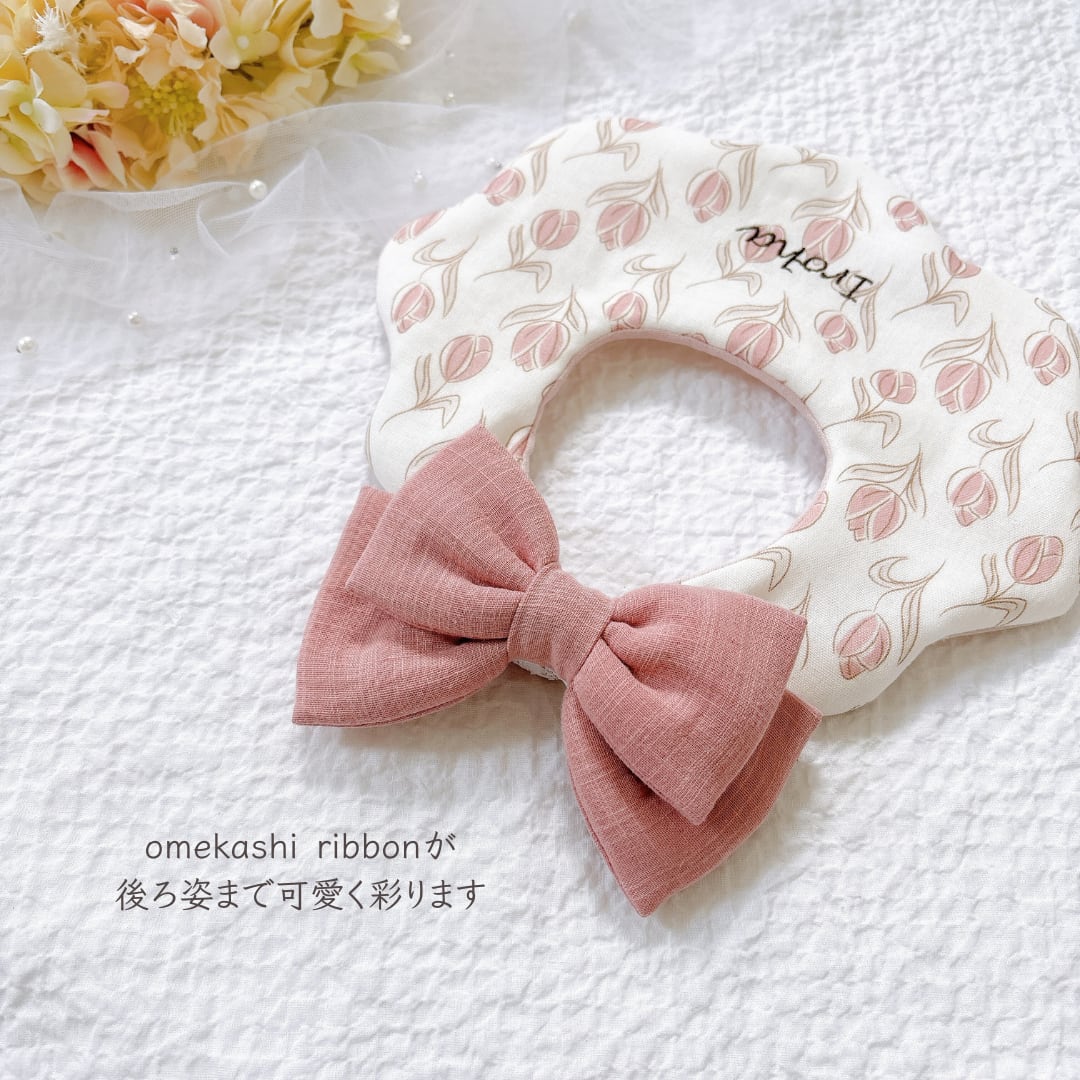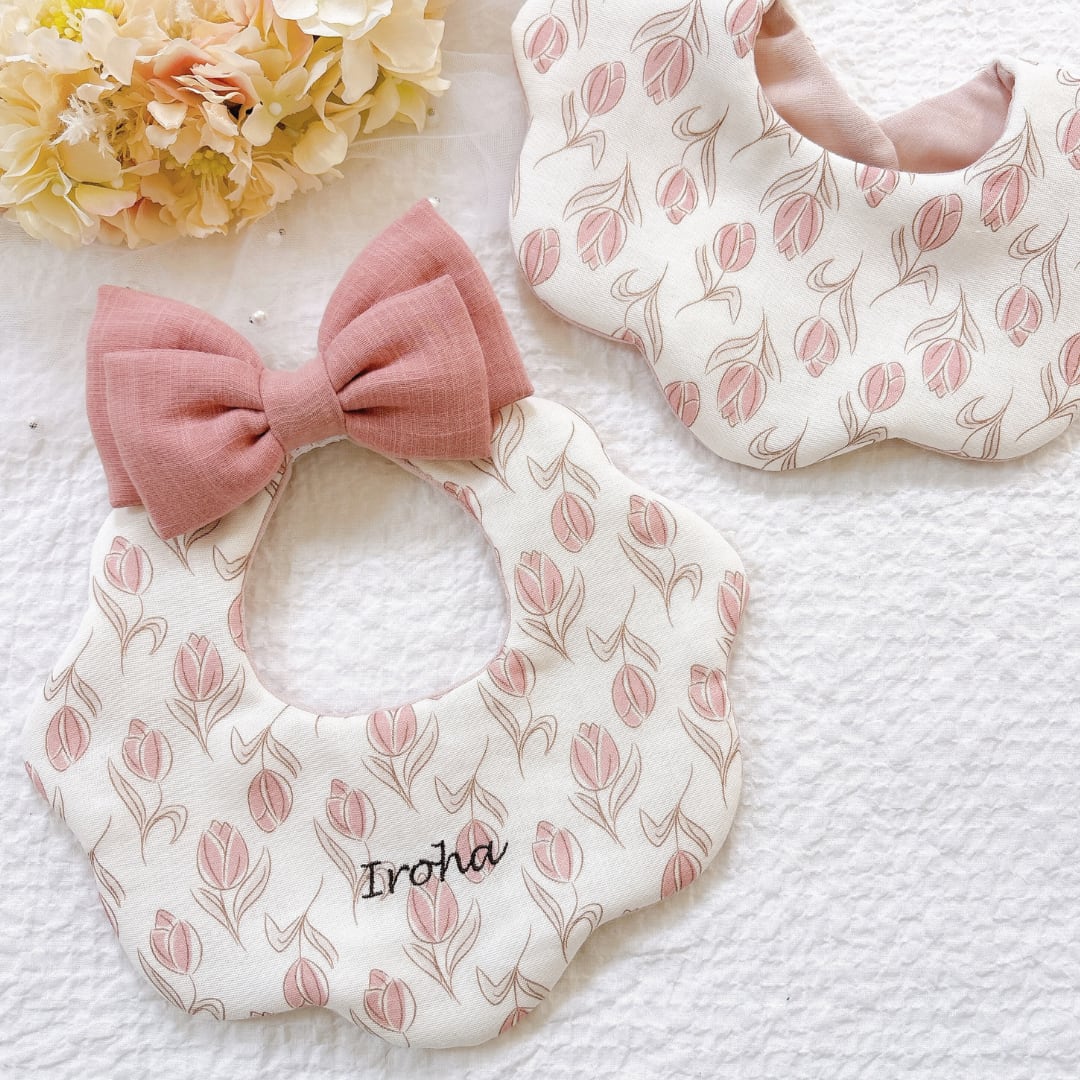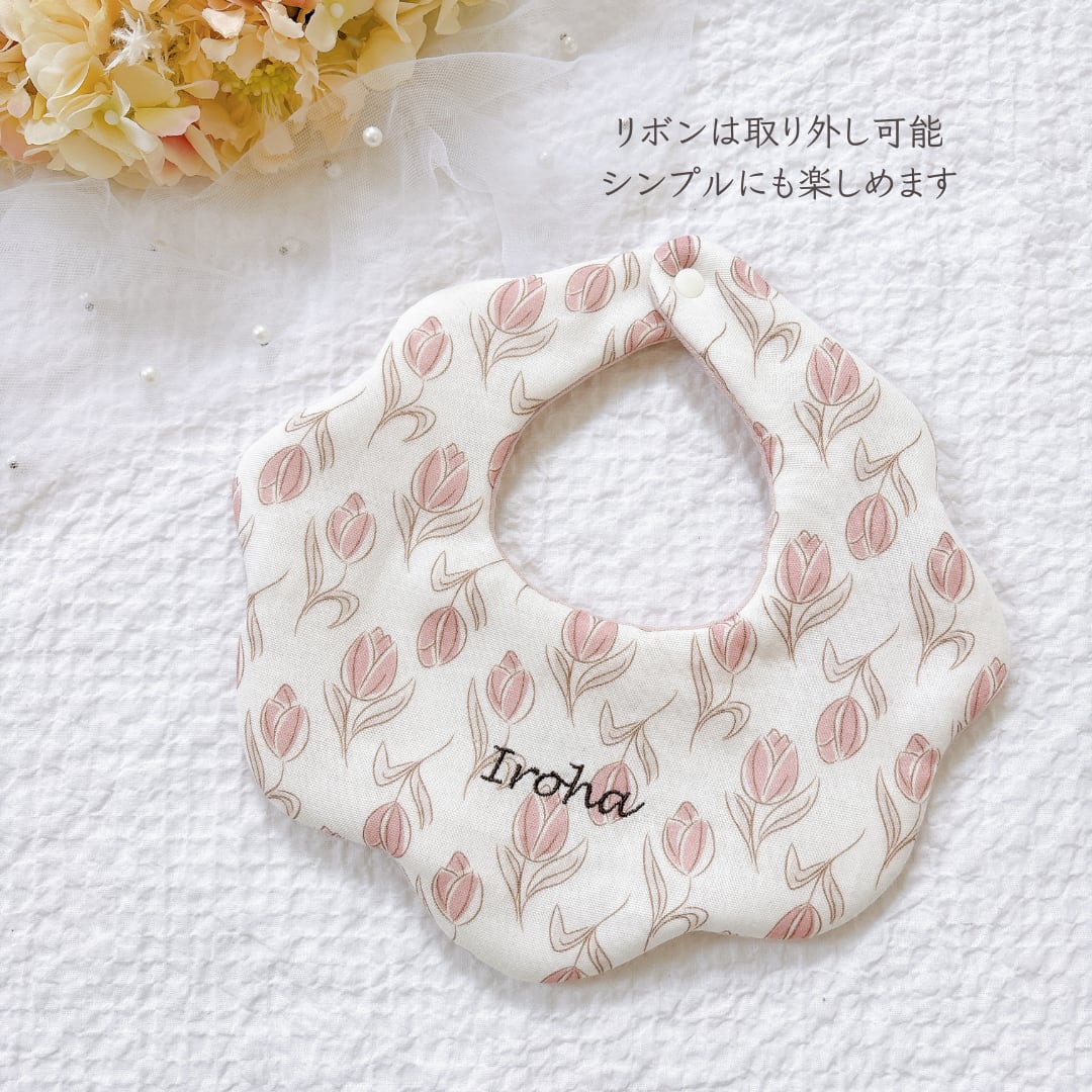 omekashi ribbon bib|チューリップ柄|リボンで楽しむおめかしスタイ|リバーシブル・名入れ可|出産祝い・ギフトに|春コーデ